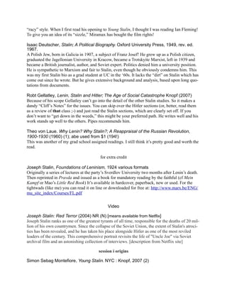 This document provides suggestions for reading and viewing materials related to Stalin's USSR, including general online resources, books, and videos. It lists Wikipedia, Google/Bing, Marxists.org, and several other websites as general online sources of information. It recommends the books Young Stalin and Stalin: The Court of the Red Tsar by Simon Sebag Montefiore, as well as biographies by Robert Service and Isaac Deutscher. Several documentary and instructional videos are also listed, covering topics like the Great Terror and Stalin's role as a leader. Sessions are outlined on origins, the Russian Revolution, the nationalities question, socialism/Great Terror, World War II, the Cold War, and victory.