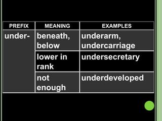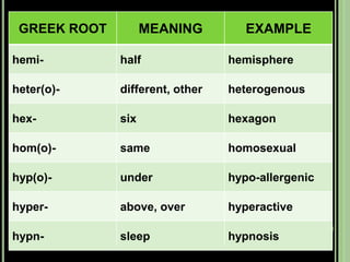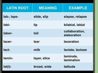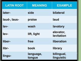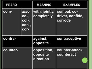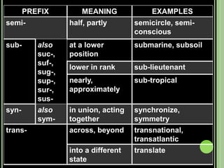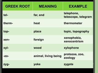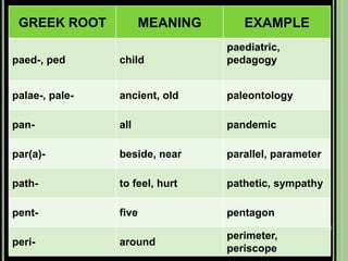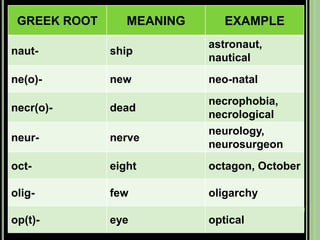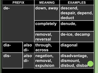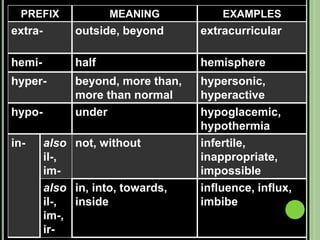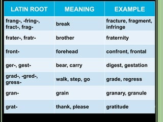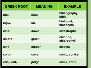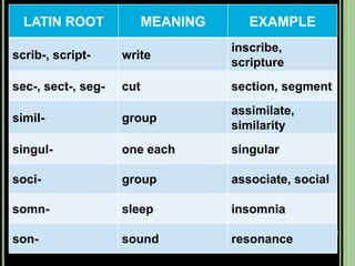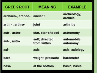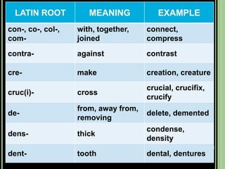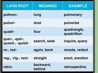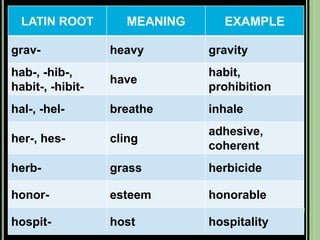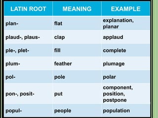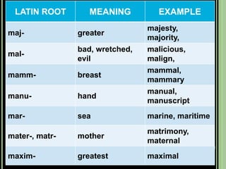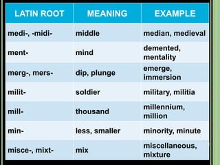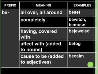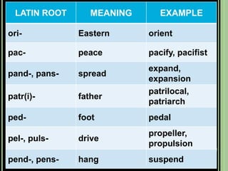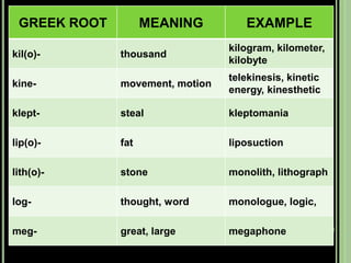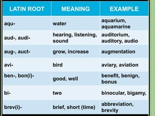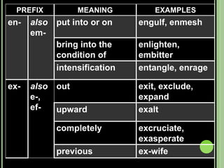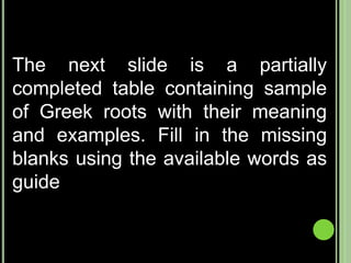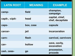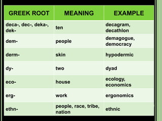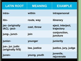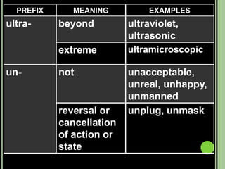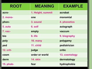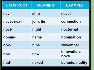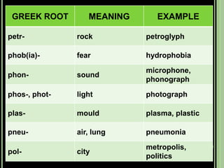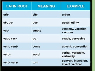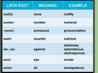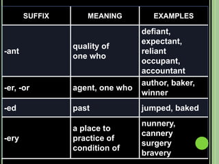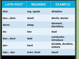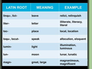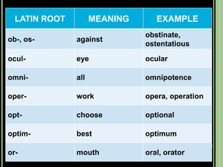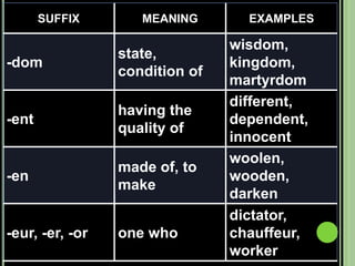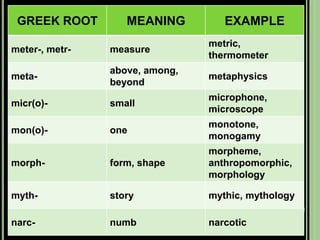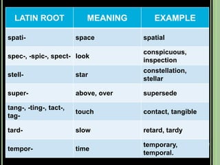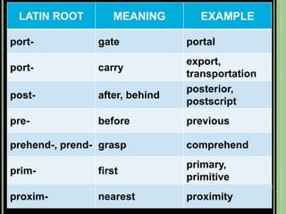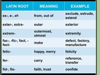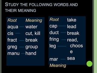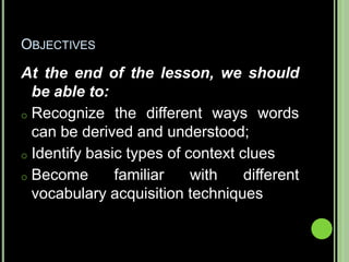The document provides objectives and content about reading vocabulary. It aims to help readers recognize how words are derived and understood through context clues, identify basic types of context clues, and become familiar with vocabulary acquisition techniques. Specific topics covered include how words are derived from other languages and personalities/places, using context clues like definition and synonyms, and understanding word structures through prefixes, suffixes, roots and affixes.