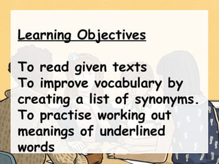 The document outlines a vocabulary development lesson scheduled for September 17th to 20th, 2024, focusing on synonym creation and comprehension skills. Learning objectives include reading texts to improve vocabulary, deciphering unfamiliar words, and facilitating group tasks to brainstorm synonyms. The lesson also incorporates a Kahoot quiz and an assignment related to assigned Sustainable Development Goals (SDGs).