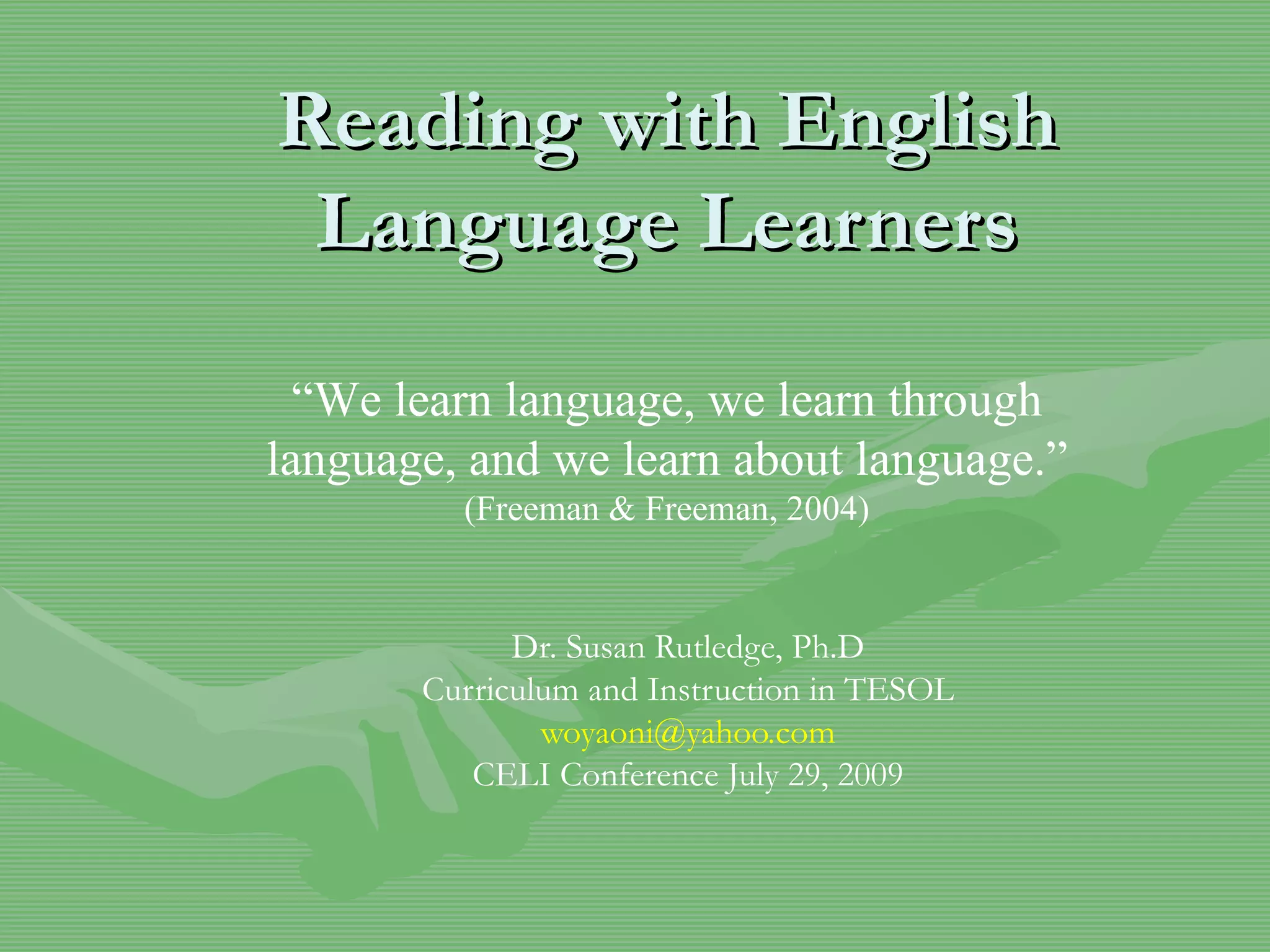 The document provides information and strategies for teachers to help English Language Learners (ELLs) with reading. It discusses who ELL students are, the challenges they face with English reading, and strategies teachers can use at the word, text, and whole-classroom level to support their reading development in English. These include utilizing students' native language skills, incorporating their cultures, using multicultural literature and videos, and providing multiple opportunities for oral language practice.