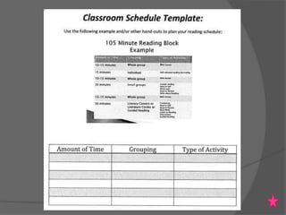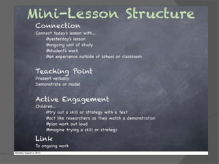 The document outlines an agenda for a reading workshop professional development plan that includes introducing reading workshop, modeling components like mini-lessons and conferring, observing teachers implementing reading workshop in their classrooms, and providing support. It also discusses establishing clear routines and expectations, using data to group students, and preparing relevant activities at students' reading levels.