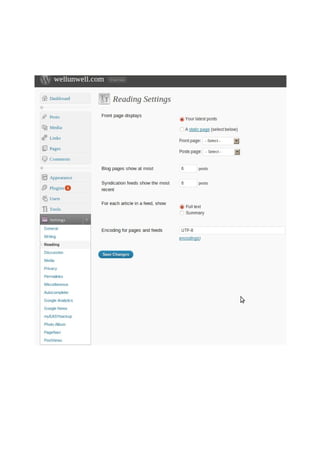 This document summarizes the Reading settings options in WordPress. It describes how to choose whether posts or a static page display on the front page. It also explains how to set the number of posts displayed on blog pages and feeds, whether to show full text or summaries in feeds, and the character encoding for pages and feeds. The document ends by reminding the user to save any changes made to the settings.