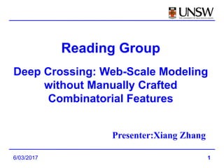 The document summarizes a research paper on Deep Crossing, a deep learning model that automatically combines features for web-scale modeling without manually crafted combinatorial features. The key points are: