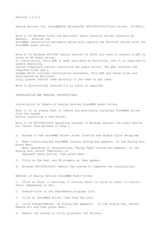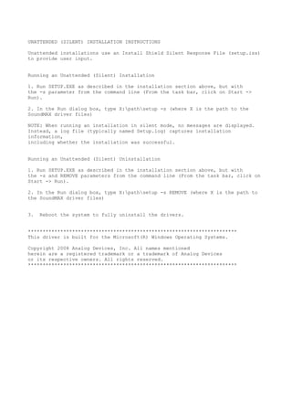 This document provides installation and removal instructions for the Analog Devices SoundMAX Windows XP/2000/2003/Vista 32/64-bit audio driver. It notes that on Windows Vista the Microsoft audio driver installs by default and SoundMAX will replace it. On older Windows systems a QFE may be required from Microsoft to allow HD audio driver installation. Unattended silent installations can be performed using the setup.iss response file and setup.exe with the -s parameter.