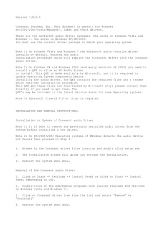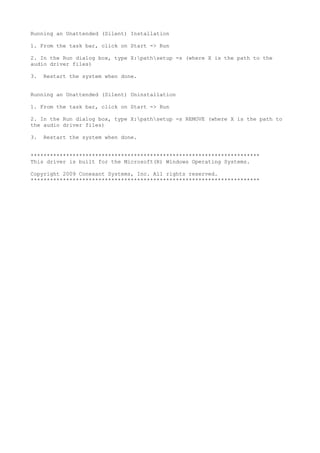 This document provides installation and removal instructions for Conexant audio drivers for Windows XP/2000/2003/Vista/Windows 7 systems. There are separate driver packages for Windows Vista/7 and Windows XP/2000/2003. The document outlines steps to install and uninstall the drivers manually or in unattended silent mode. It also notes requirements like removing any existing audio driver first and needing a Microsoft QFE for some older operating systems.