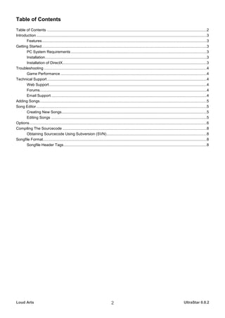 This document is a user guide for UltraStar 0.8.2, a karaoke game that allows users to sing songs and compete against friends. It details how to install the game, add songs, and use the song editor. Technical support options are also provided, including checking the website, forums, and email for help with any issues. The guide provides information on system requirements, installation instructions, troubleshooting tips, and an overview of the game's features.