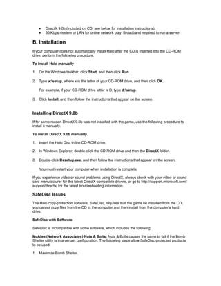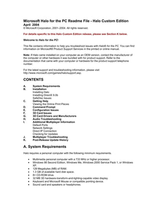 This document provides troubleshooting information for Halo for PC. It includes system requirements, installation instructions, and solutions to common issues such as configuration problems, 3D card issues, and multiplayer troubleshooting. For details specific to the Halo Custom Edition release, see Section K which provides an update history.