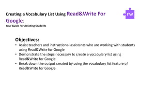 This document provides instructions for creating a vocabulary list using Read&Write for Google. It explains that creating vocabulary lists can help students build familiarity with novel words and improve reading comprehension. The steps outlined include selecting words to highlight, using the highlight tool, and generating the list by clicking the vocabulary button. The completed list in a new Google Doc tab displays the word, its meaning, and a picture definition for each highlighted term from the original text.