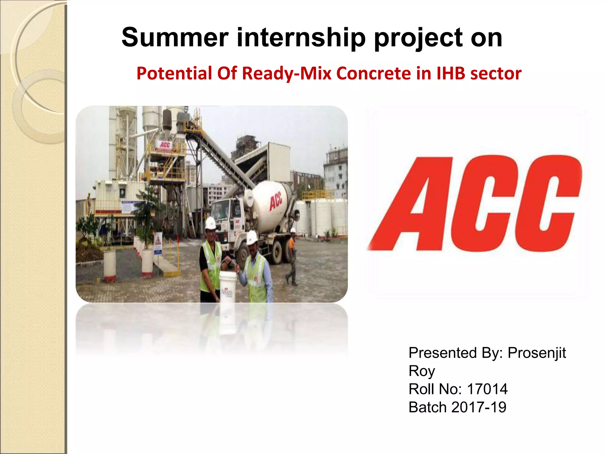 This document provides information about ready-mix concrete (RMC), including its history, composition, production process, and use in India. Some key points: