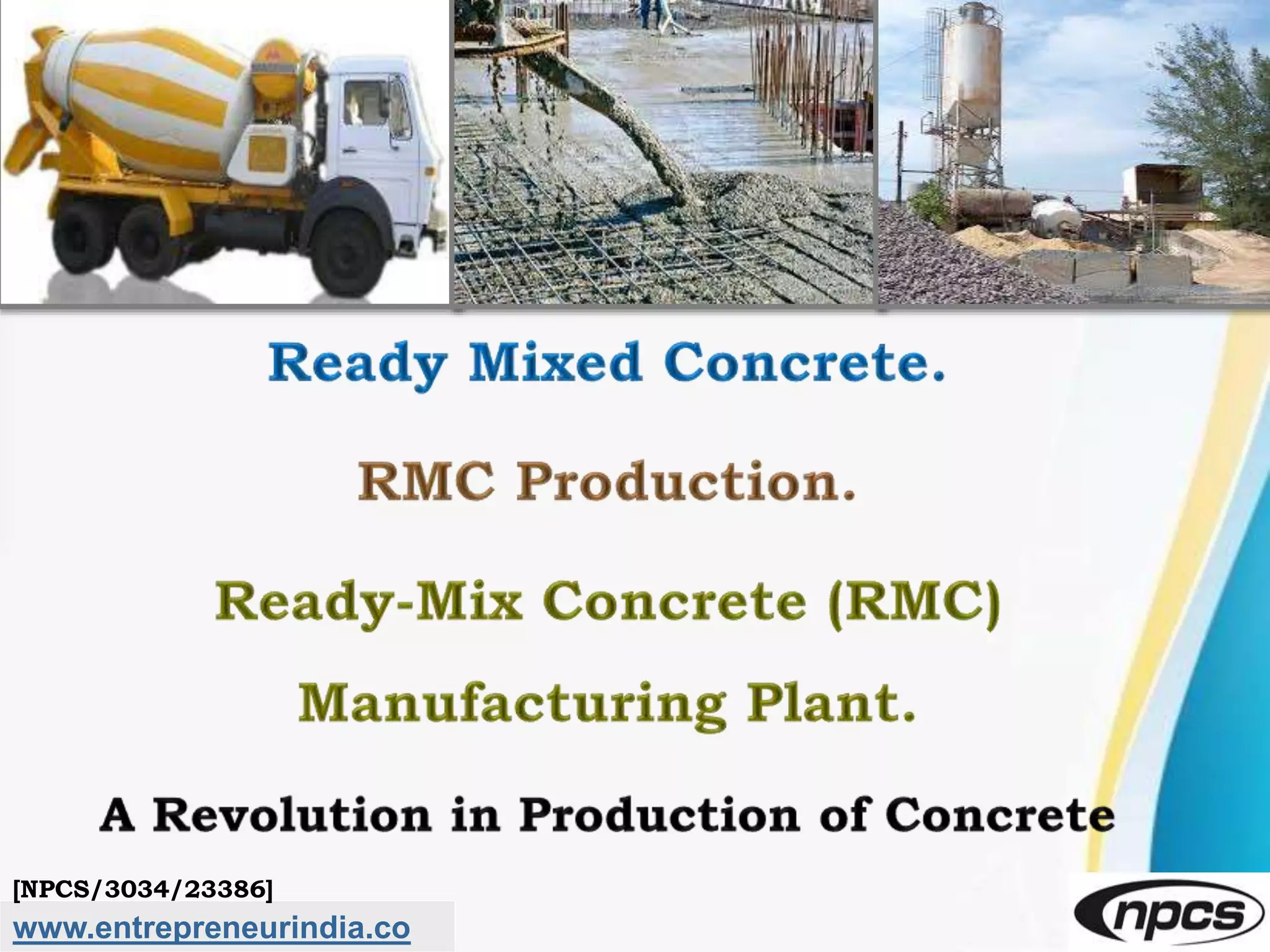 The document provides a comprehensive overview of ready-mix concrete (RMC), highlighting its composition, manufacturing process, and advantages over traditional concrete mixing methods. It discusses the market potential and growth drivers for RMC, particularly in developing countries, while emphasizing its applications in construction, infrastructure, and environmental benefits. Additionally, the document outlines financial considerations, project feasibility, and operational requirements for setting up an RMC plant.
