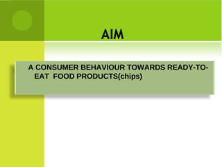 The document presents research on consumer behavior towards ready-to-eat food products (chips) in India. The objectives are to analyze factors influencing buying behavior of chips and study brand composition and preference. A survey was conducted using a questionnaire to collect data from respondents in Pune on their chip preferences. The analysis found that most respondents aged 21-25 prefer ready-to-eat foods. Service sector workers also showed high preference. Uncle Chips and Lays were the most popular brands. Factors like age, occupation, and income influence buying behavior of chips.