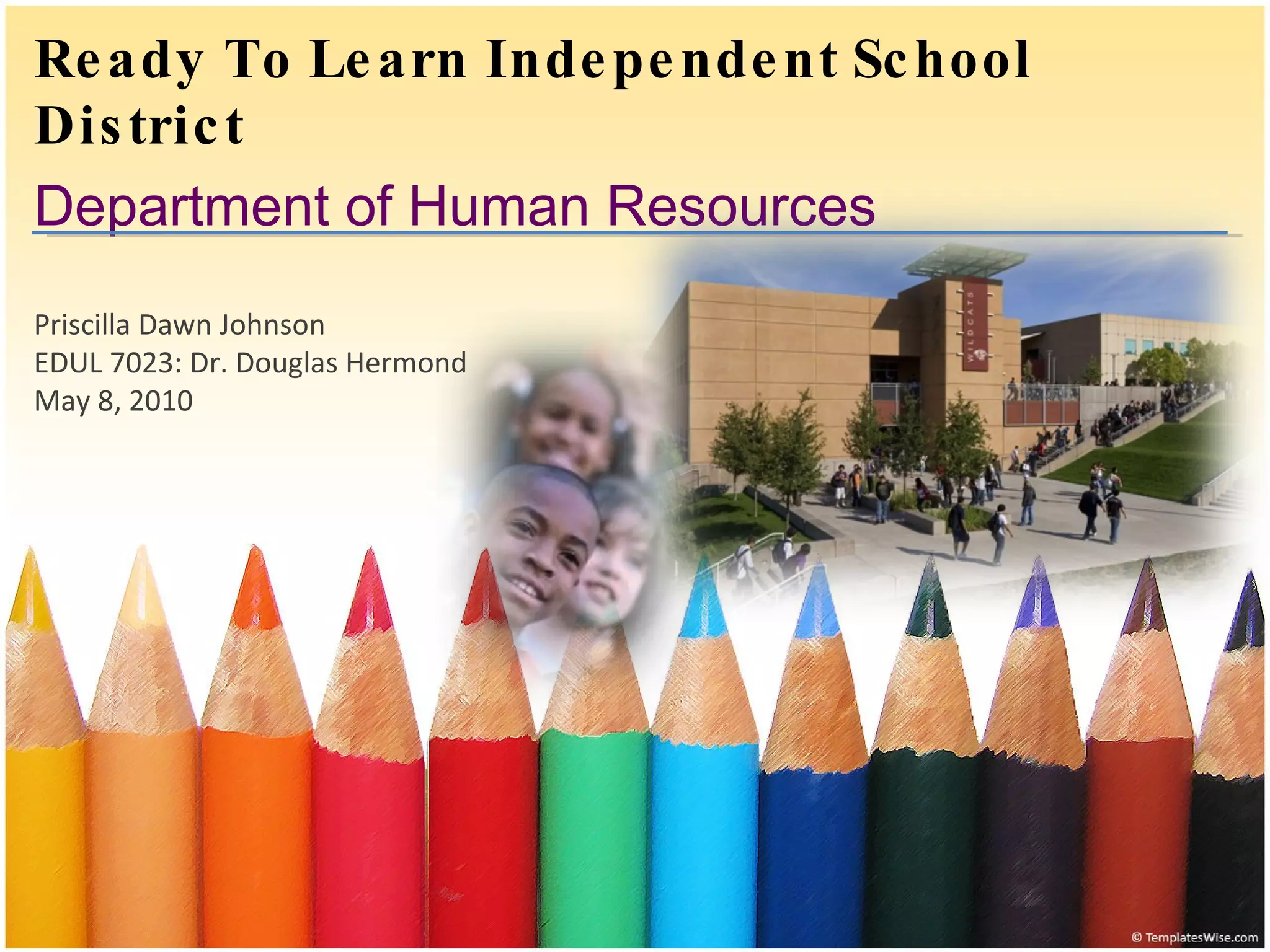 The document outlines the mission, goals, structure, and strategies of the Ready To Learn Independent School District Department of Human Resources. The department aims to recruit and retain a talented and diverse workforce to support high academic achievement for students. Key goals include providing staff development, supporting new teachers, and encouraging community involvement. The organizational structure follows a professional bureaucracy model with shared decision-making. Compensation includes performance-based pay. The technical core of the school's focus is on cognitive development and social constructivism.