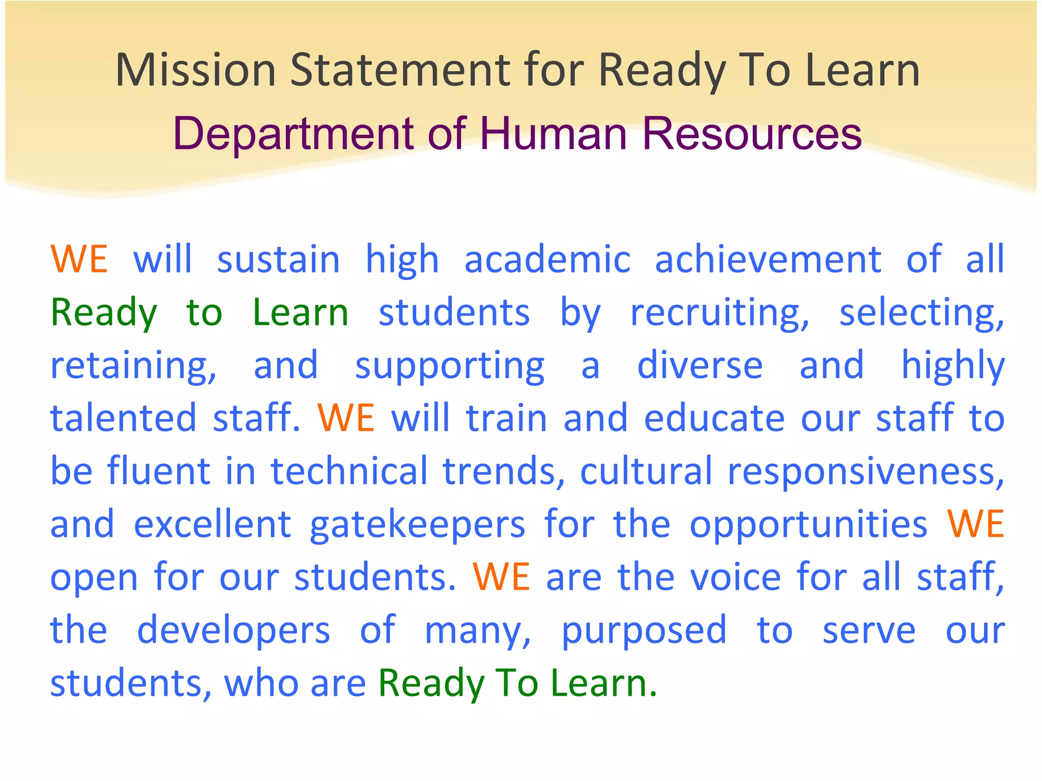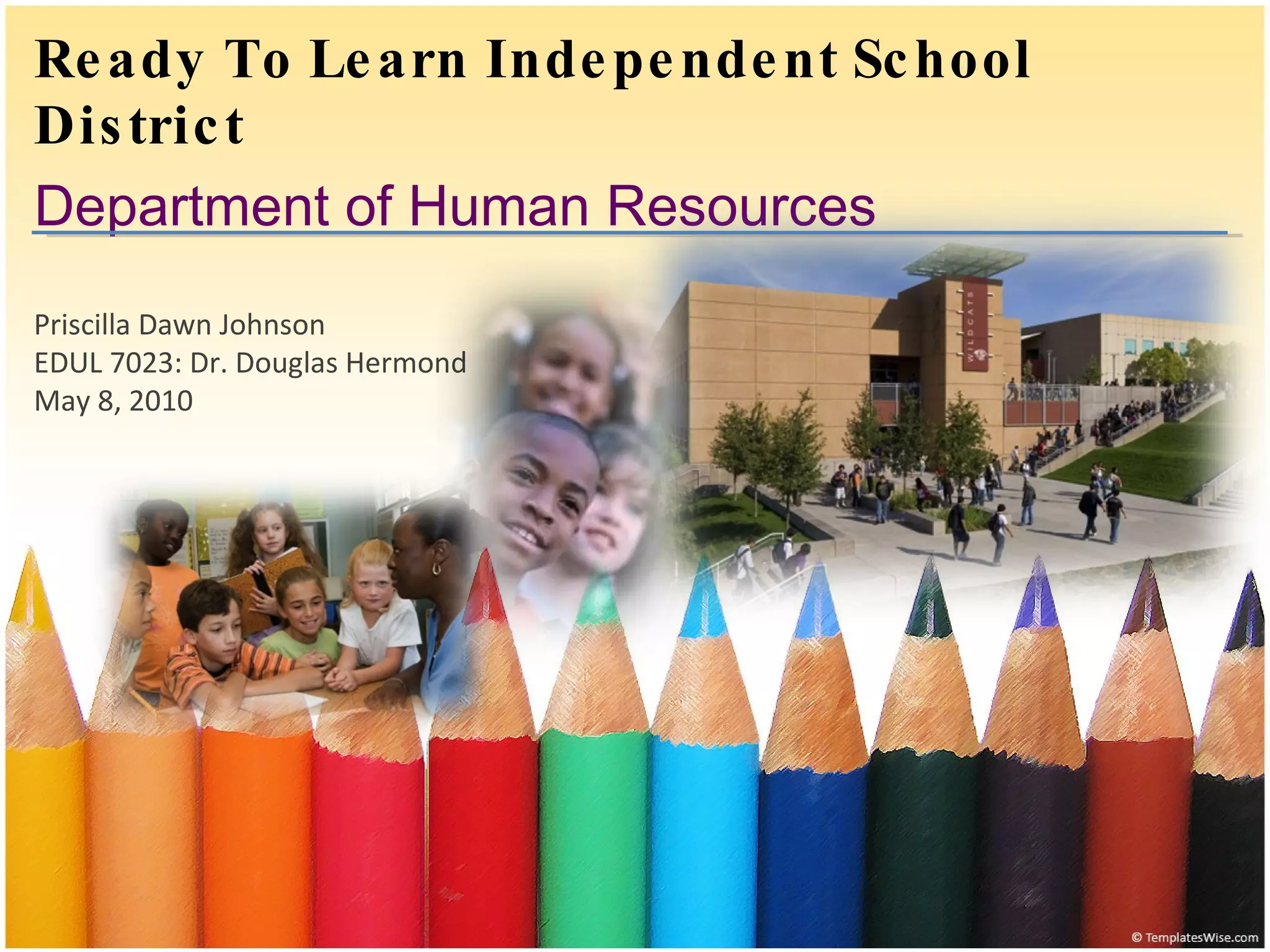 The document outlines the mission, goals, structure, and strategies of the Ready To Learn Independent School District Department of Human Resources. The department aims to recruit and retain a talented staff to support high student achievement. Key goals include providing staff development, supporting student teachers, and implementing performance-based pay. Teaching methods are based on cognitive development and social constructivism, utilizing student-centered learning tactics and cultural tools.