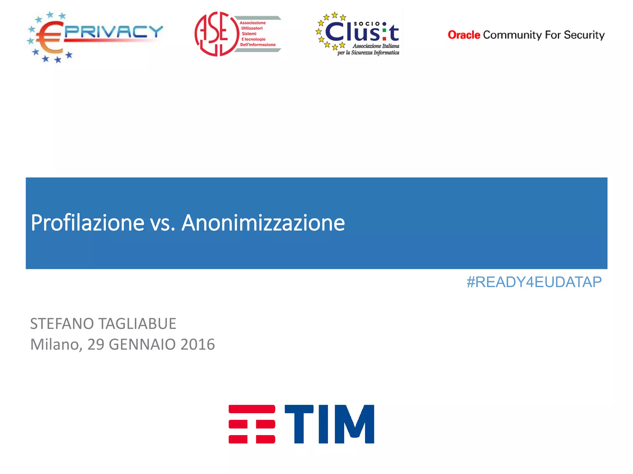 Il documento discute le differenze tra profilazione e anonimizzazione dei dati secondo il GDPR, evidenziando le misure di protezione dei dati e i diritti degli interessati. Viene anche presentato un caso d'uso dell'anonimizzazione nel progetto 'Trentino Open Living Data' per analizzare flussi di dati, nonché i requisiti per la pseudonimizzazione. Infine, si menzionano le linee guida dell'Article 29 Working Party su big data e anonimizzazione.