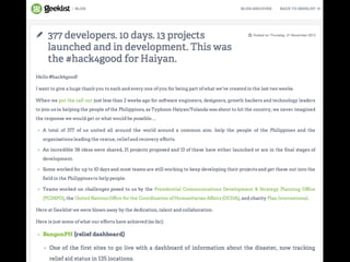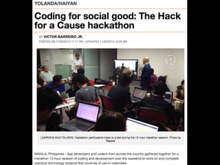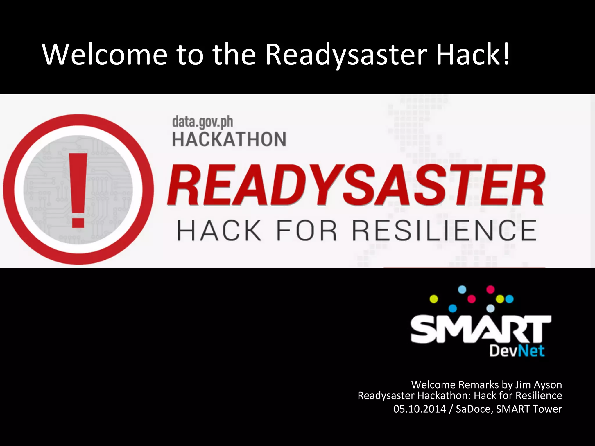 1) Jim Ayson welcomes participants to the Readysaster Hackathon and introduces himself and his role at SMART Communications.