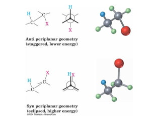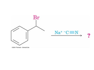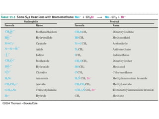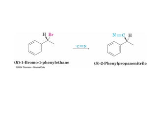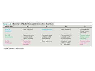 The document summarizes key concepts about nucleophilic substitution and elimination reactions of alkyl halides. It discusses the SN1 and SN2 substitution mechanisms, and the E1 and E2 elimination mechanisms. The SN1 reaction involves formation of a carbocation intermediate and proceeds through two steps, while the SN2 reaction occurs in a single concerted step with the nucleophile and leaving group interacting simultaneously. The E1 reaction eliminates the leaving group first to form a carbocation, while the E2 reaction involves a concerted elimination. Stereochemistry and factors affecting reactivity such as stability of carbocations, solvent effects, and steric hindrance are also covered.