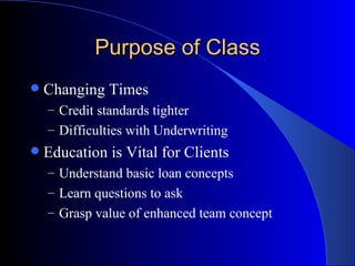 This document provides an overview of real estate loan options and the loan process. It discusses how the market has changed since the housing boom, with tighter credit standards and more conventional loans. It also outlines the steps of pre-qualification versus pre-approval, how to calculate debt-to-income ratios, the importance of assets and credit history, and factors lenders consider like risk-based pricing.