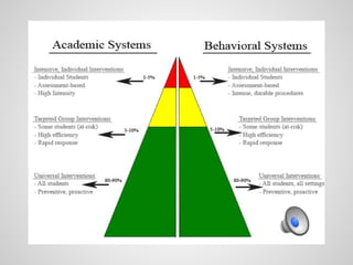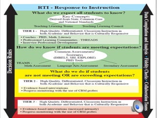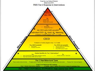 This document provides an overview of PBIS (Positive Behavioral Interventions and Supports) Tier 2 strategies being implemented in the Fond du Lac School District. It discusses the need to move beyond universal strategies to also implement more targeted Tier 2 interventions with fidelity. Examples of Tier 2 interventions include Check-In/Check-Out, social academic instructional groups, and targeted classroom environmental strategies. The document also discusses using data teams to review behavioral data and identify students who may need Tier 2 supports. Overall, the goal is to establish consistent Tier 2 processes and interventions across the district to provide additional layers of academic and behavioral support for students not responsive to universal strategies alone.