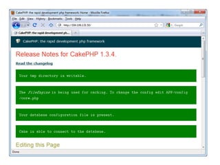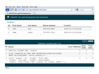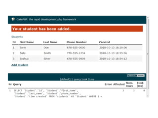 This document provides an overview of building a real world web application in 2 hours or less using CakePHP and MySQL. It introduces the speakers and demonstrates connecting to a server, setting up a database with tables and sample data, and using CakePHP's MVC framework to build out a student management application with basic CRUD functionality. Key aspects covered include generating models, controllers and views to display and add students. The goal is to provide an interactive follow along tutorial for creating a simple but functional web app from start to finish in a short period of time.
