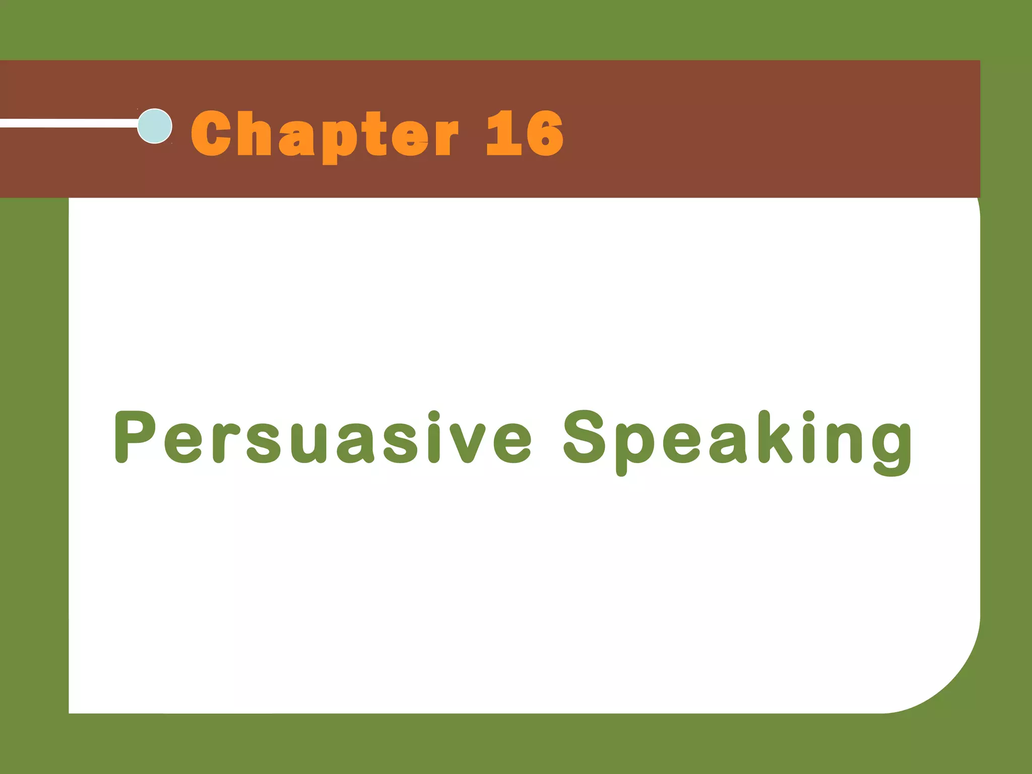 This chapter discusses persuasive speaking, including developing a persuasive topic and thesis, evaluating listeners, and choosing an organizational strategy. It explains that the goals of persuasive speaking are to influence attitudes, beliefs, and behaviors by using rhetorical proofs like ethos, logos, and pathos. It also discusses understanding the audience, avoiding logical fallacies, and common organizational patterns like problem-solution for structuring a persuasive speech.