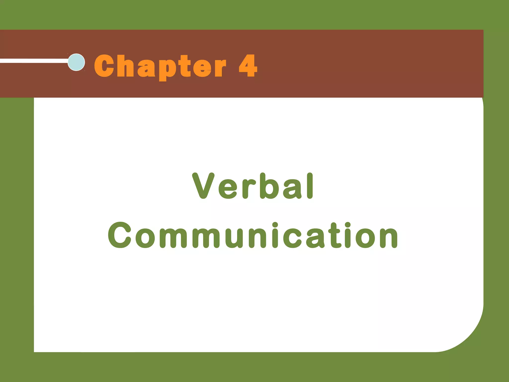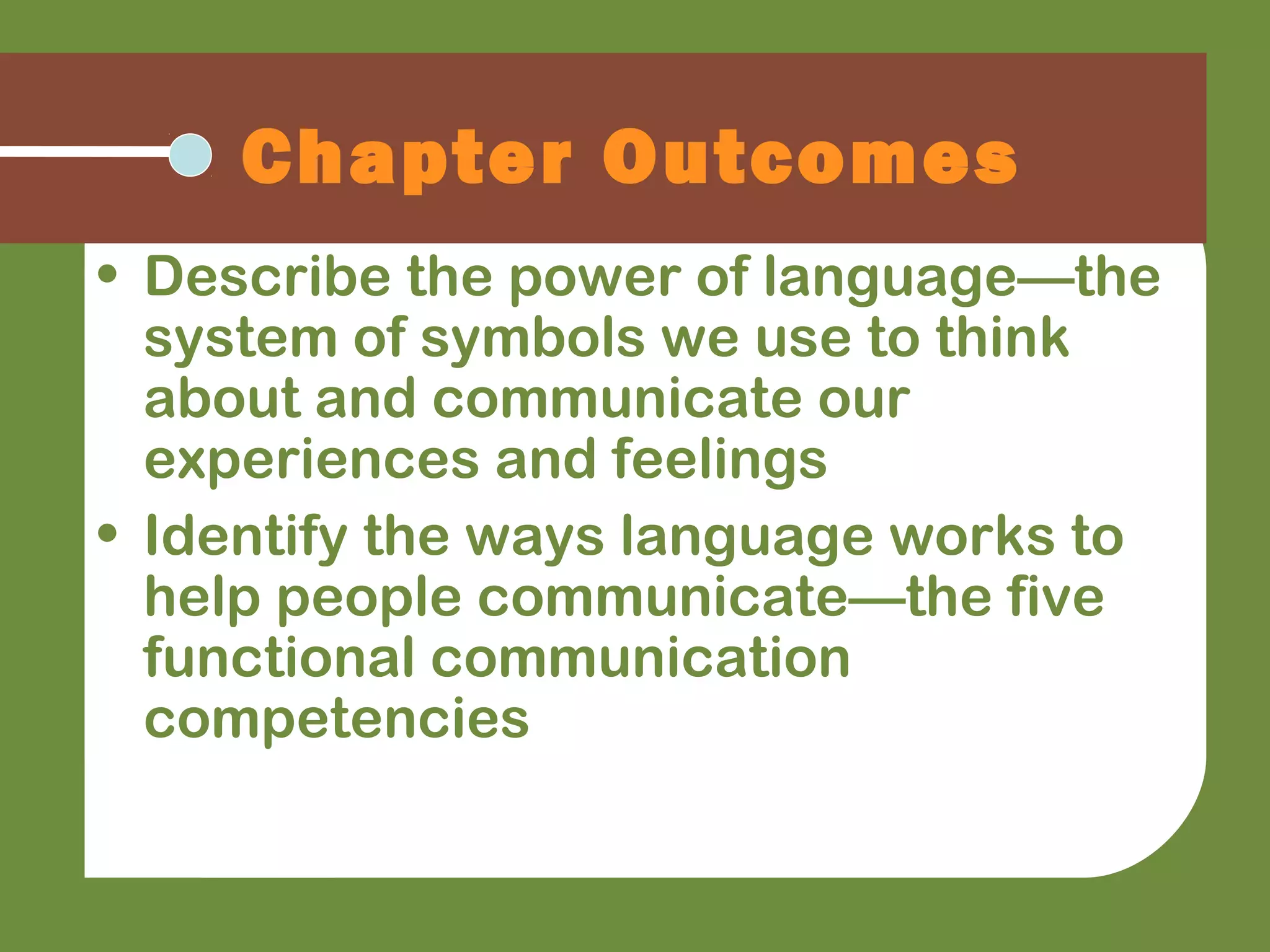 This chapter discusses verbal communication and language. It describes how language is used to think and communicate experiences through a system of symbols. It identifies the five functional communication competencies of using language to control, share information, express feelings, be creative, and manage conversations. The chapter also addresses problems that can occur with language abstraction, meaning, labeling, and biased terms. Finally, it examines how language reflects and determines the relational, situational, cultural, and mediated contexts of communication.