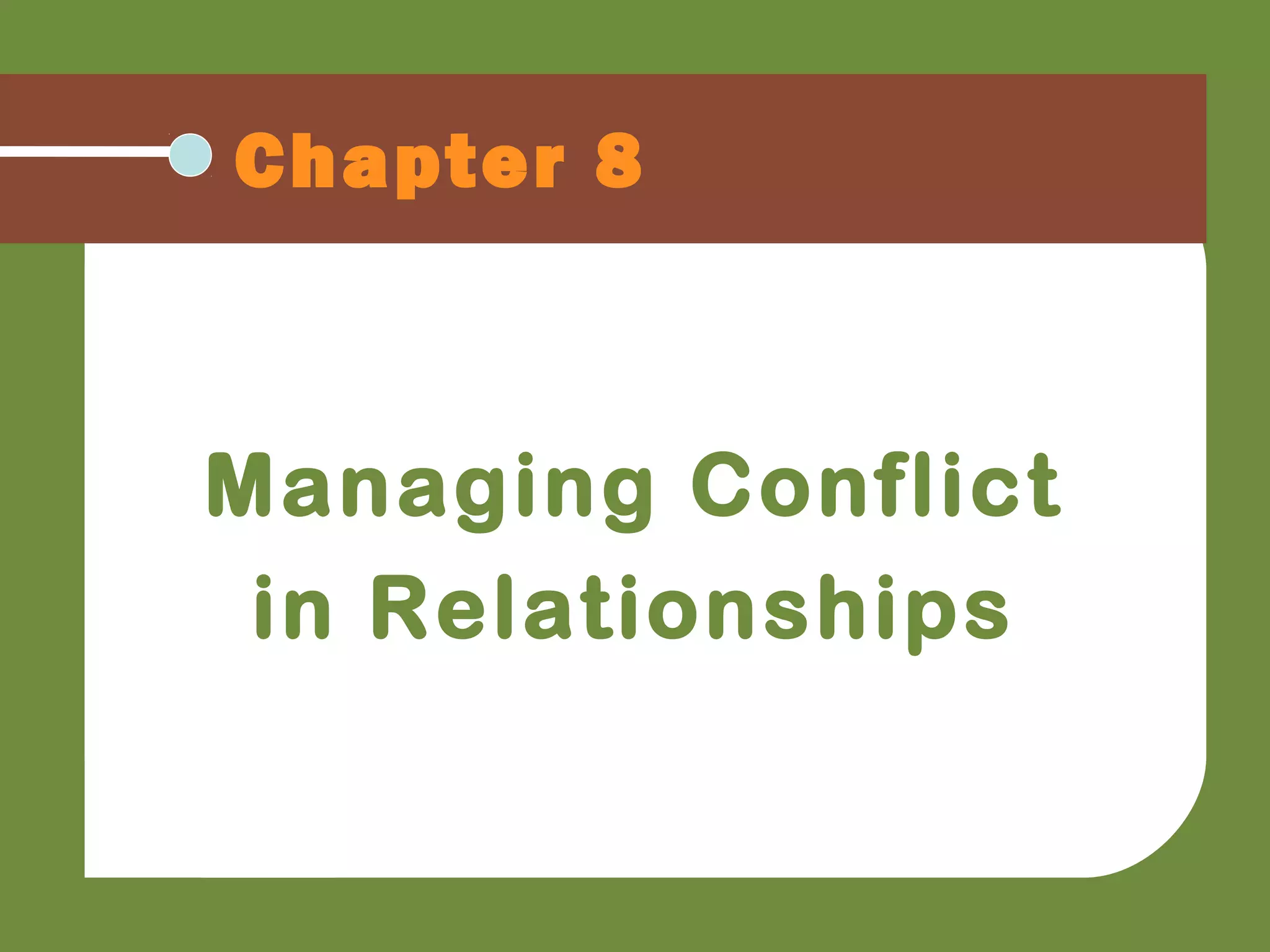 This chapter discusses managing conflict in relationships. It identifies factors that can lead to productive or unproductive conflict, such as inaccurate perceptions, incompatible goals, or provocation. Conflict triggers include aggression, identity threats, or lack of fairness. How people handle conflict is influenced by power dynamics, culture, gender differences, communication channels, and anonymity online. Strategies for managing conflict include escapist, challenging, or cooperative approaches. Outcomes can include compromise, win-win resolutions where both sides' goals are met, lose-lose where neither side wins, separation, or allocating decision-making power.