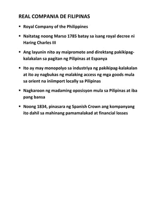 Ang Real Compania de Filipinas ay itinatag noong Marso 1785 sa ilalim ng royal decree ni Haring Charles III upang itaguyod ang direktang pakikipagkalakalan sa pagitan ng Pilipinas at Espanya. Nagkaroon ito ng monopolyo sa industriya ng pakikipagkalakalan at nagbigay ng access sa mga kalakal mula sa Orient. Noong 1834, ito ay pinasara ng Spanish crown dahil sa mahinang pamamalakad at mga pagkalugi.