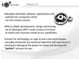 Ideangine develops software, applications, and websites for various sectors to match clients' business needs. They offer mobile app development on iOS, Android, Blackberry, and Windows platforms. A real estate company can boost its brand and sales in the digital space through an interactive mobile app developed by Ideangine that allows prospects to search properties, view amenities and features through photos, videos and virtual tours. Ideangine has developed successful mobile apps for clients in real estate, jewelry, healthcare and other industries.