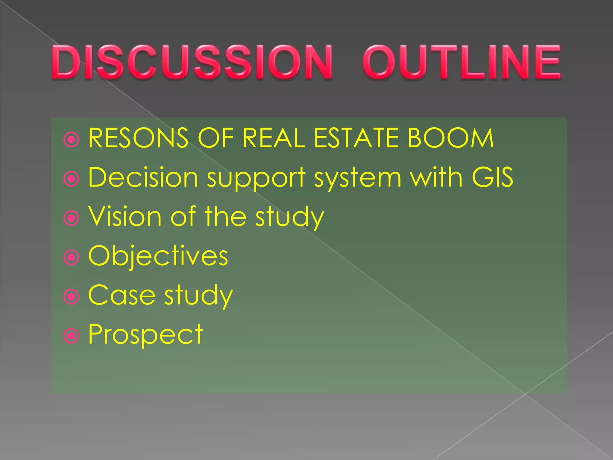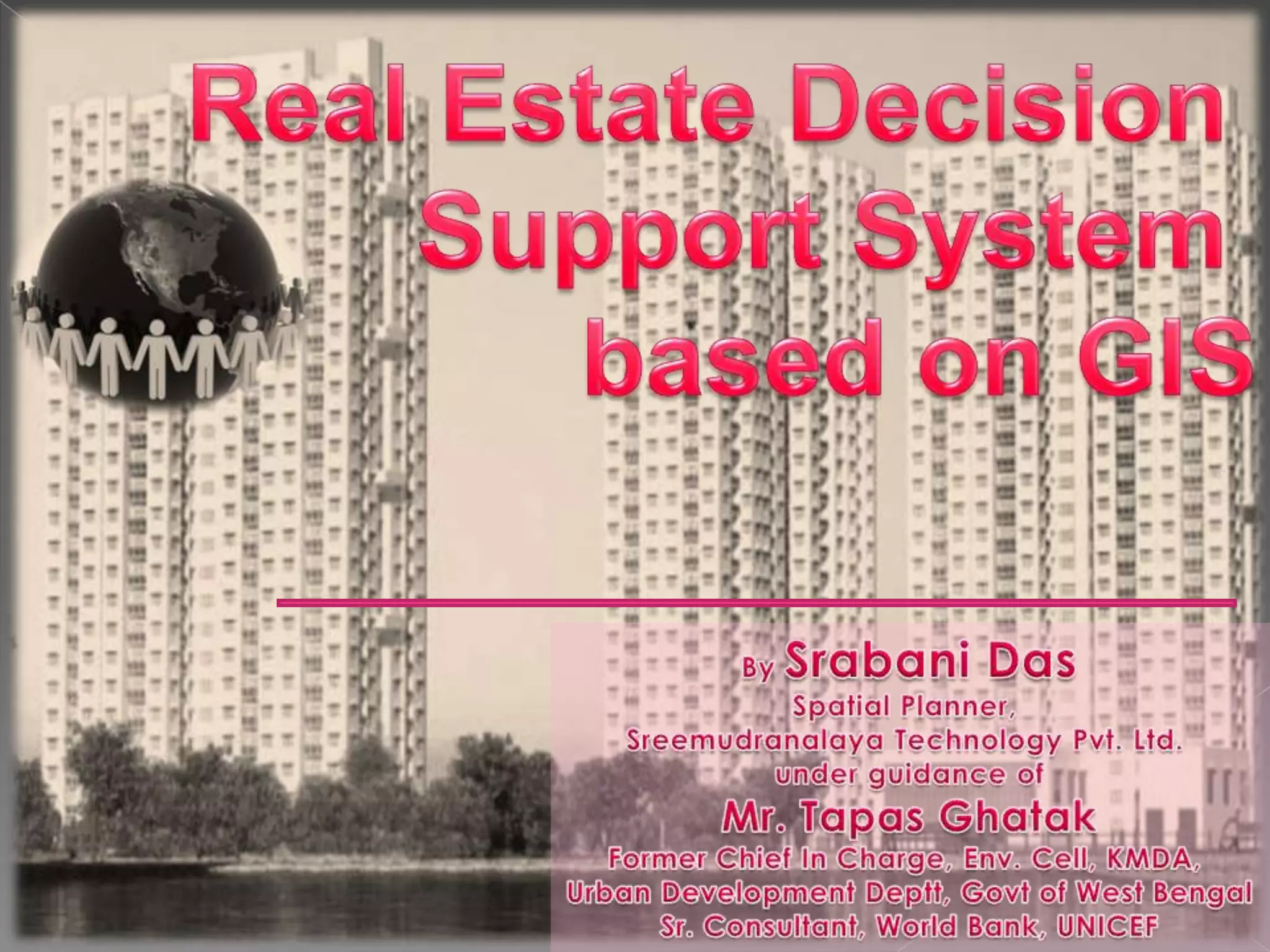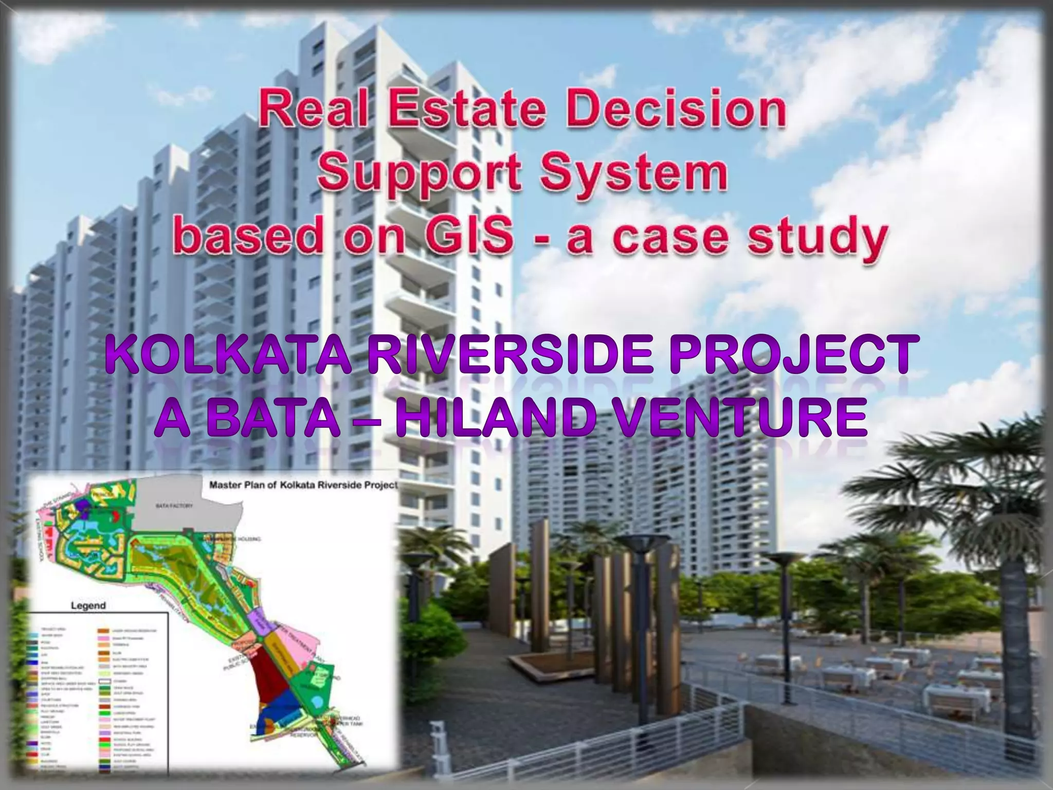 The document discusses the factors driving a real estate boom, including economic growth and rising disposable incomes, along with the development of a decision support system (DSS) using GIS for real estate management in a smart city context. It outlines the objectives of building various information systems to support prospective buyers and enhance management in the Calcutta Riverside project. Additionally, it highlights the company's efforts to establish a robust framework for smart infrastructure to facilitate urban development.