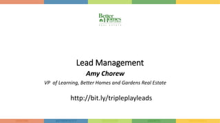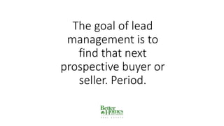 The document discusses strategies for lead management in real estate. It recommends having the right mindset to continuously find new buyers and sellers. It also recommends adapting to changes in home buyers, who are now more likely to be first-time buyers and do more online research. Key lead management strategies include developing an automated follow-up system, creating valuable online content and resources for leads, using social media and reviews, staying active on listings, and guiding buyers through the entire home buying process from research to closing. The goal is to nurture leads at each stage and use automation tools to stay top-of-mind until they are ready to purchase.