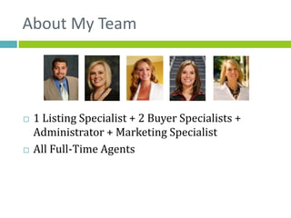 The document summarizes the performance and marketing strategies of the Keller Williams Realty Southpark team in 2011. The team increased sales by 60% in 2011, closing 56 homes for $9.9 million in total sales volume, significantly outperforming the average agent. They emphasize using professional photography and listing on over 600 sites to get maximum exposure. Their open houses are very successful due to the online marketing. The document outlines their process from contract to close.