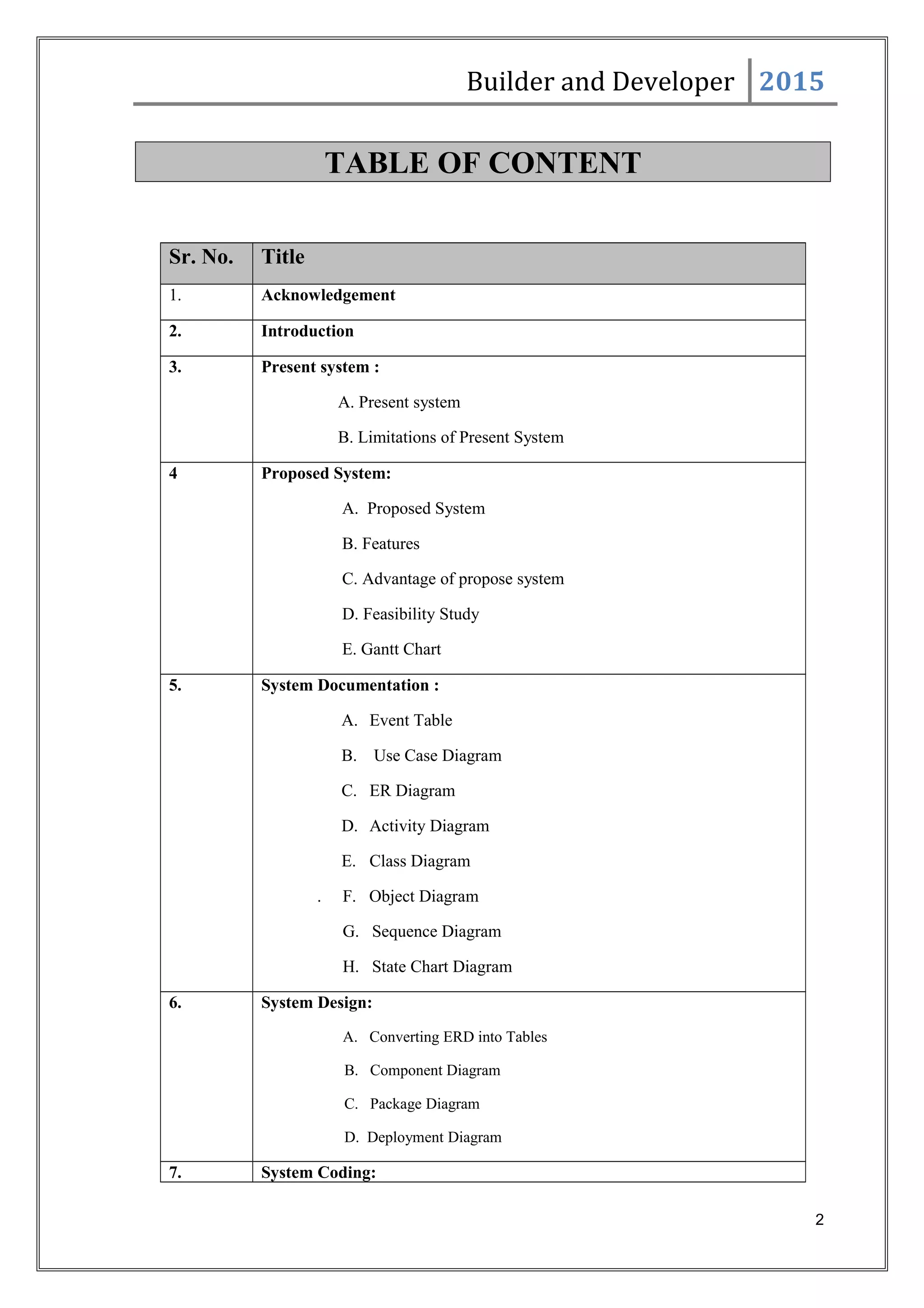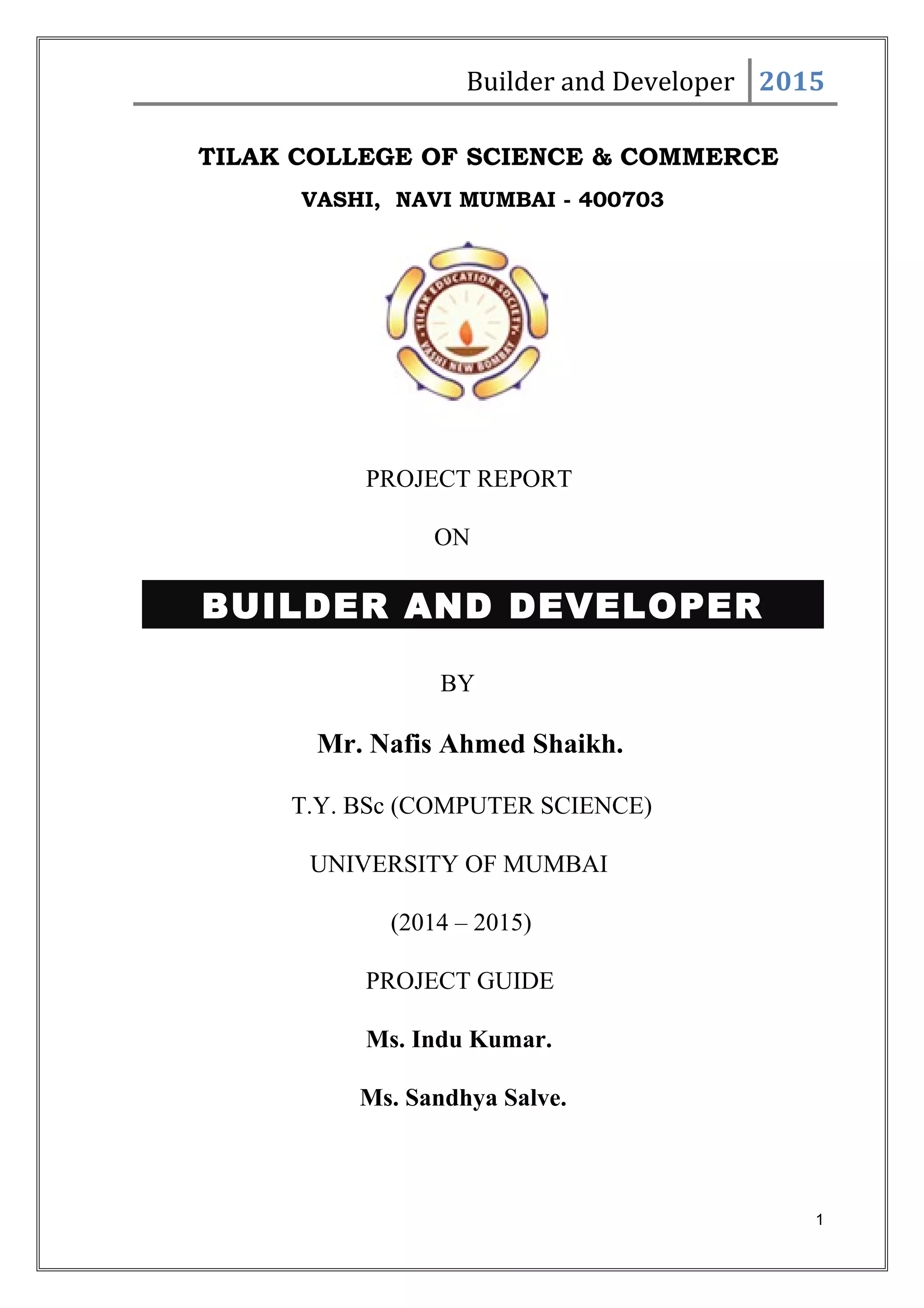 This document outlines a project report for developing a property management software system. It includes sections on the present manual system and its limitations, the proposed computerized system and its features/advantages, a feasibility study analyzing operational, economic and technical feasibility, a Gantt chart project schedule, and documentation of the system requirements and design such as use case diagrams, entity relationship diagrams, and class diagrams to model the system.