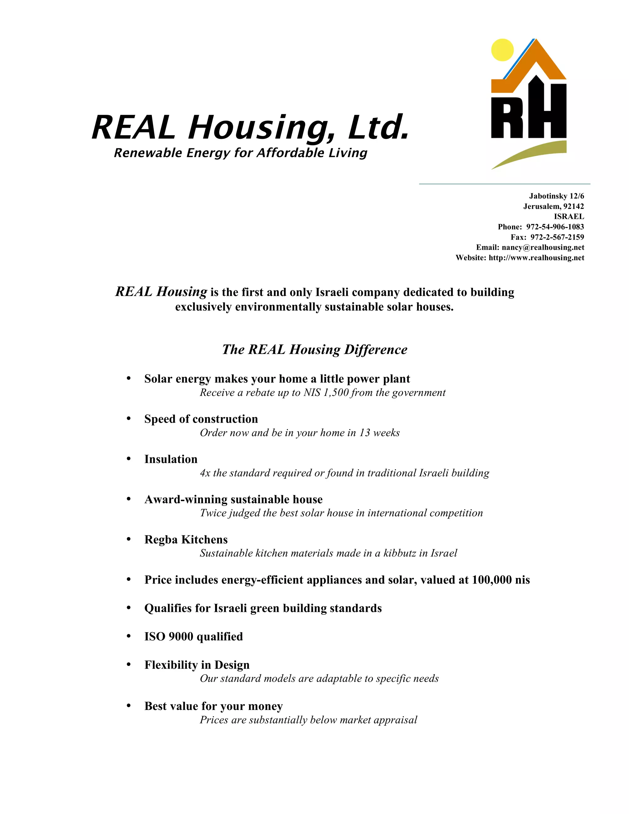 REAL Housing is an Israeli company that builds exclusively solar-powered homes to promote renewable energy and affordable living. Their homes generate solar energy, qualify for government rebates, and are constructed faster than traditional homes using superior insulation. REAL Housing has won international awards for their sustainable house design and offers energy-efficient appliances, solar power systems, and flexible customization, all at prices below market value.