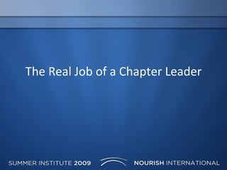 The document outlines the real job of a chapter leader, which is to act as a liaison and support the executive board and members. As a liaison, the leader must effectively communicate and represent the chapter at meetings. Their main role is supporting and leading the group by providing resources and feedback to allow members to succeed, rather than completing all tasks themselves. Additional duties include setting and achieving goals, building future capacity, and ensuring the chapter operates responsibly and maintains its campus charter. Key skills for fulfilling these roles are managing conflict, leading effective meetings, and defining success for the chapter.