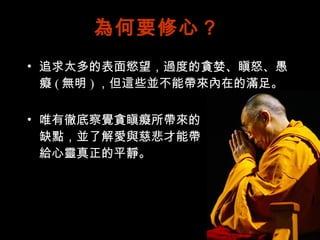 為何要修心? 追求太多的表面慾望,過度的貪婪、瞋怒、愚癡 (