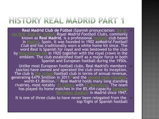 Real Madrid Club de Fútbol, commonly known as Real Madrid, is a professional football club based in Madrid, Spain that was founded in 1902 and has traditionally worn an all-white home kit. Under the presidency of Santiago Bernabéu from 1945-1978, Real Madrid established itself as a dominant force in Spain and Europe, winning the European Cup (now UEFA Champions League) six times. The club's home stadium since 1947 has been the 85,454-capacity Santiago Bernabéu Stadium in Madrid.