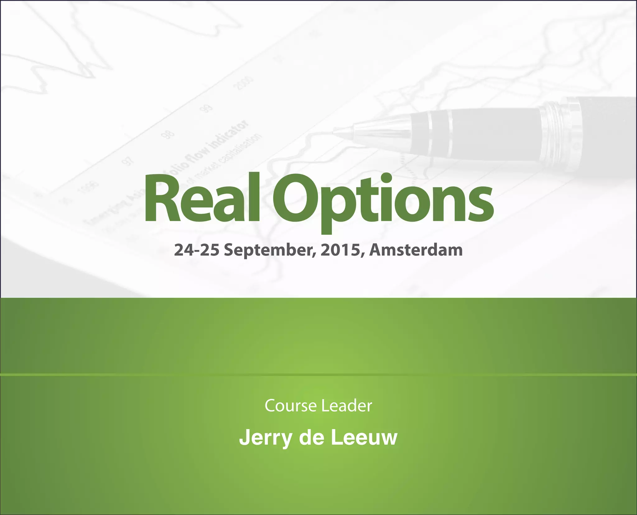 This document outlines a hands-on course on real options, scheduled for September 24-25, 2015, in Amsterdam, led by Jerry de Leeuw. The course aims to educate non-mathematical professionals on various aspects of real options, including valuation, sensitivity analysis, and practical applications in energy markets. Participants will receive comprehensive materials and engage in interactive learning, suitable for traders, risk managers, and other finance professionals.