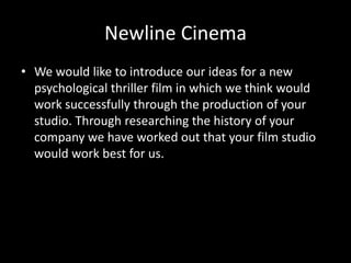 Newline Cinema is pitching a new psychological thriller film to the studio. They believe Newline would be a good fit because it has successfully produced and distributed many top psychological thrillers in the past, including The Number 23, A Nightmare on Elm Street, The Conjuring, and Final Destination 5.