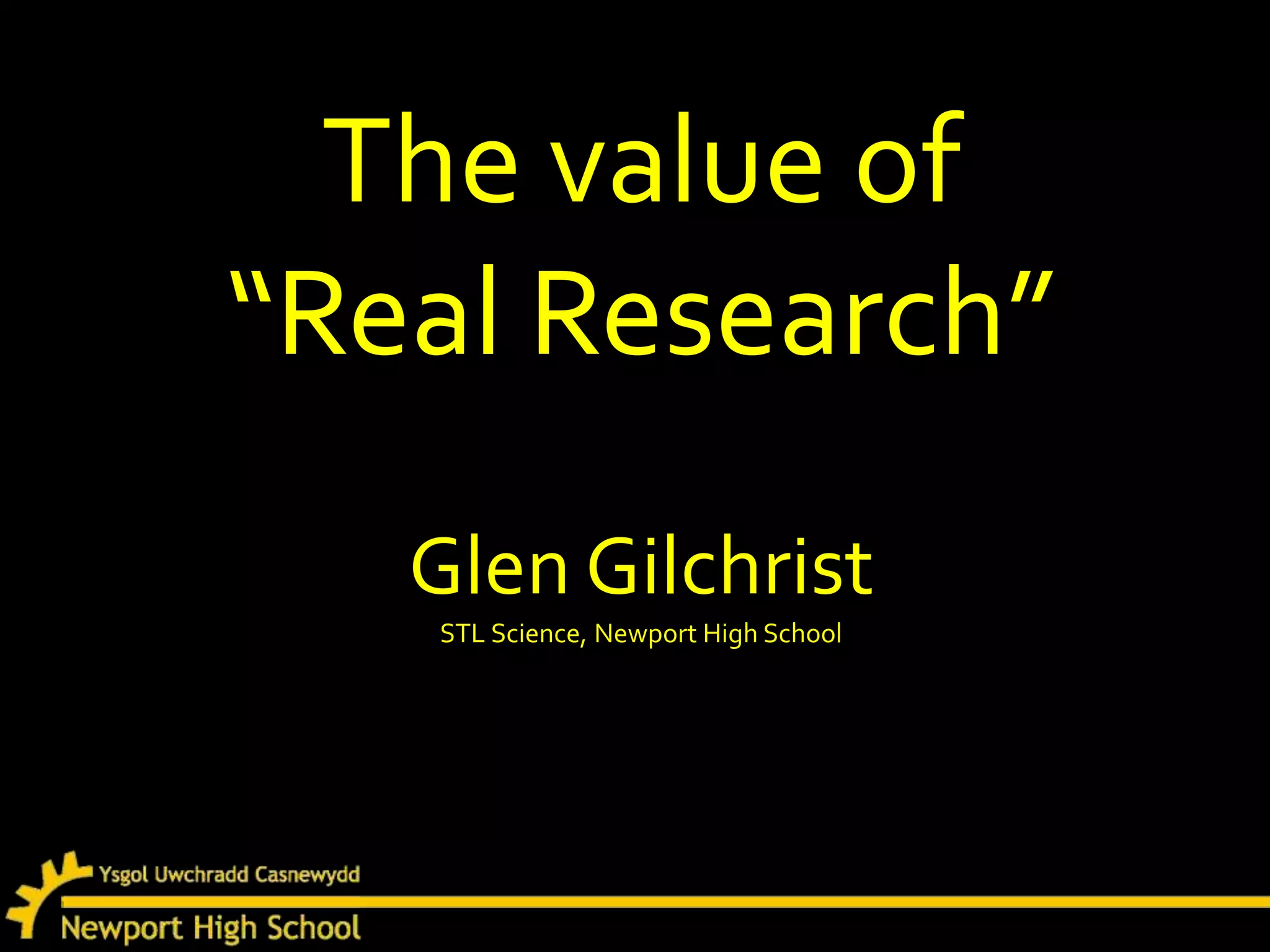 This document discusses the value of using "real research" in the classroom rather than "pseudocontext" examples. It provides an example of a "real research" project conducted by students to investigate the effects of acid rain on snail shell strength. The students contacted snail farmers to identify a meaningful problem, researched the topic, designed an experiment to test different acid strengths and concentrations, and analyzed the results. The conclusions found shell strength varied by up to 15% depending on acid concentration. The document argues this type of authentic research helps students learn science processes and something new, rather than just solving contrived problems.