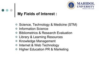 The document discusses Mahidol University's implementation of social networking platforms. It provides details on Mahidol University's presence and activities on platforms like Facebook, Twitter, YouTube and blogs. It also discusses how libraries and faculties in Thailand are using social media platforms like Twitter. The document promotes the use of social networking tools for research collaboration and keeping up with research. It provides contact information for the author and invites the audience to follow her social media accounts.