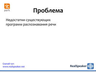 Документ описывает стартап ООО «Реалспикер Лаб», который разработал видео-фильтр для повышения точности программ распознавания речи на 20%. Основные проблемы существующих технологий заключаются в подверженности шуму и необходимости интернет-доступа, в то время как новое решение предлагает параллельный анализ аудио и видео потоков. Стартап планирует продвигать свою технологию через модель freemium и ориентируется на широкий спектр применения, включая голосовой поиск и мобильные устройства.