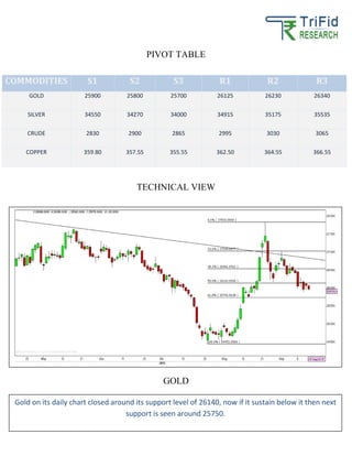 The document provides technical analysis for gold, silver, crude oil, and copper commodities with specific pivot table values for support and resistance levels. Gold is currently at a critical support level of 26140, with a potential decrease to 25750 if it fails to sustain above this point. The information is sourced from Trifid Research, which includes a disclaimer.