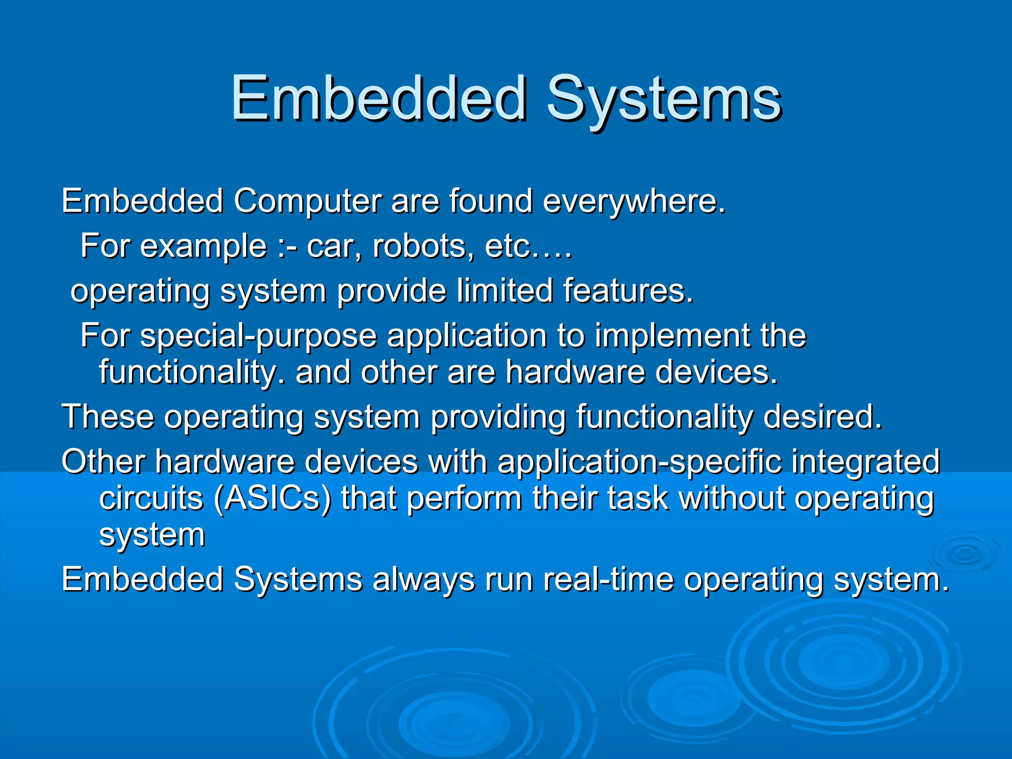 Embedded systems often use real-time operating systems to provide limited functionality for special-purpose applications. A real-time operating system can successfully run real-time processes that must respond to events within a certain time period. Real-time systems can be hard, where all delays are bounded to guarantee tasks complete on time, or soft, where critical real-time tasks get priority until completed but delays are not strictly bounded. In contrast, a time-sharing operating system allows many users to simultaneously share computer resources by allocating time slices and passing control between users and their processes.