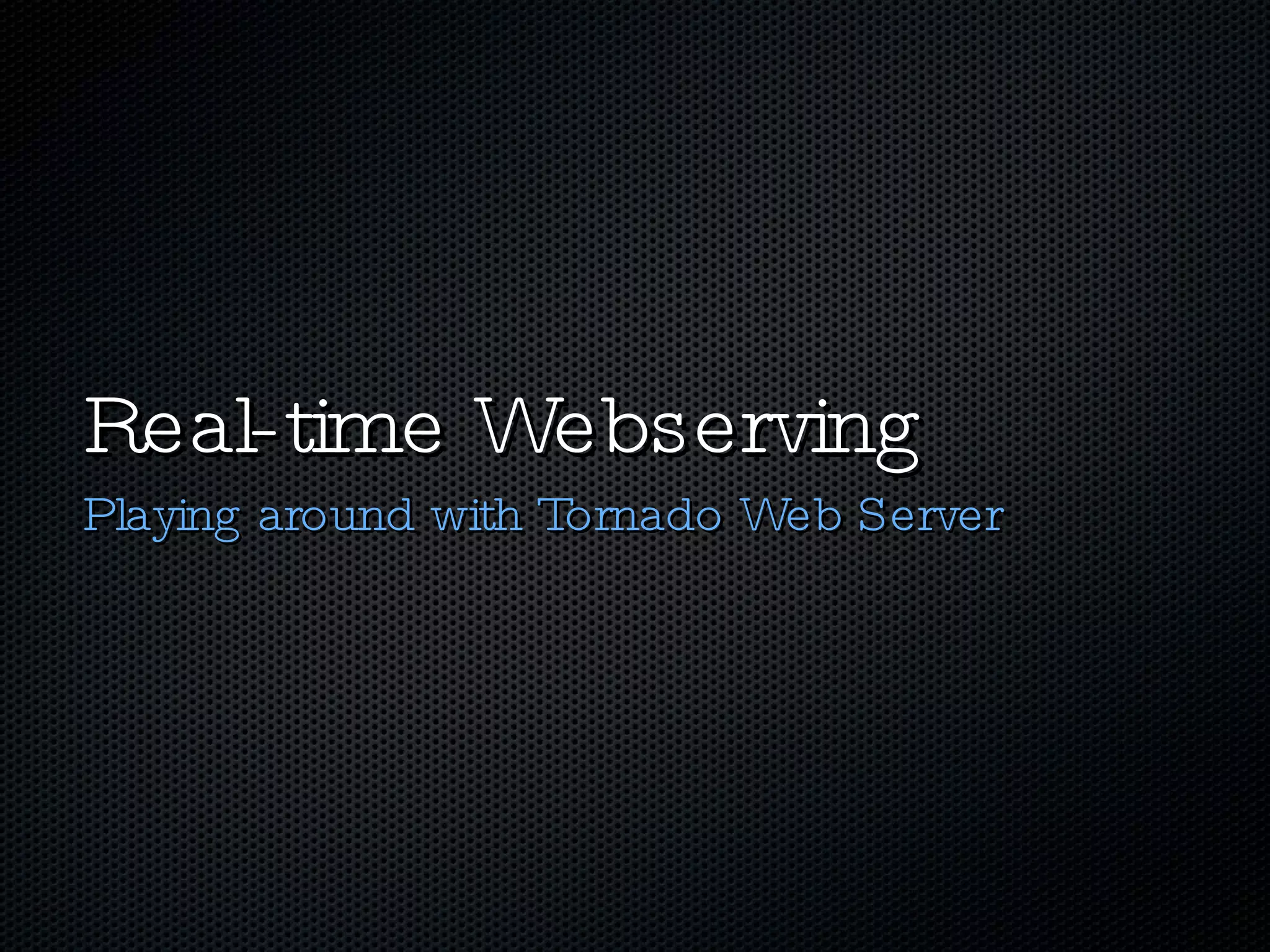 Tornado is a Python web framework that focuses on speed and handling large amounts of simultaneous traffic. It allows starting multiple sub-domains on different ports with auto-reloading capabilities. Tornado handles requests by routing them to different handlers that can render templates and return responses. It also supports asynchronous delayed responses using asynchronous HTTP clients.