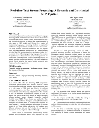 The document proposes a real-time architecture using Apache Storm and Apache Kafka to apply natural language processing (NLP) tasks to streams of text data. It allows developers to inject NLP modules from different programming languages in a distributed, scalable, and low-latency manner. An experiment was conducted using OpenNLP, Fasttext and SpaCy modules on Bahasa Malaysia and English text, and Apache Storm achieved the lowest latency compared to other frameworks.
