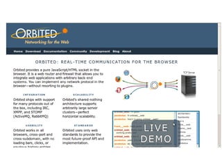 The document discusses the integration of real-time web technologies, specifically using Django, Orbited, and Morbidq to create a real-time pledging system called 'ideas2gather' for a Newcastle council health and well-being partnership event. It details the technical setup including prerequisites like Python, JavaScript, and various frameworks used, such as Comet and STOMP for messaging. The author shares a personal account of their journey in developing this system, including challenges faced with browser compatibility.