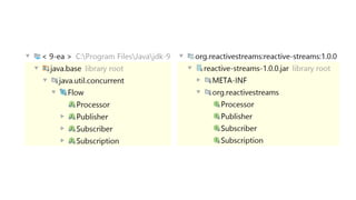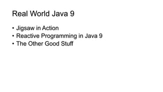 This document provides an overview of new features in Java 9 including Jigsaw modularization, reactive programming enhancements, and other updates. Key points covered include better performance from Jigsaw and memory and hardware optimizations, integration of the Reactive Streams API, a new module system that encourages cleaner design and deployments, and the addition of the JShell REPL tool. Potential issues for migration are also noted around structural changes needed and tooling maturity.