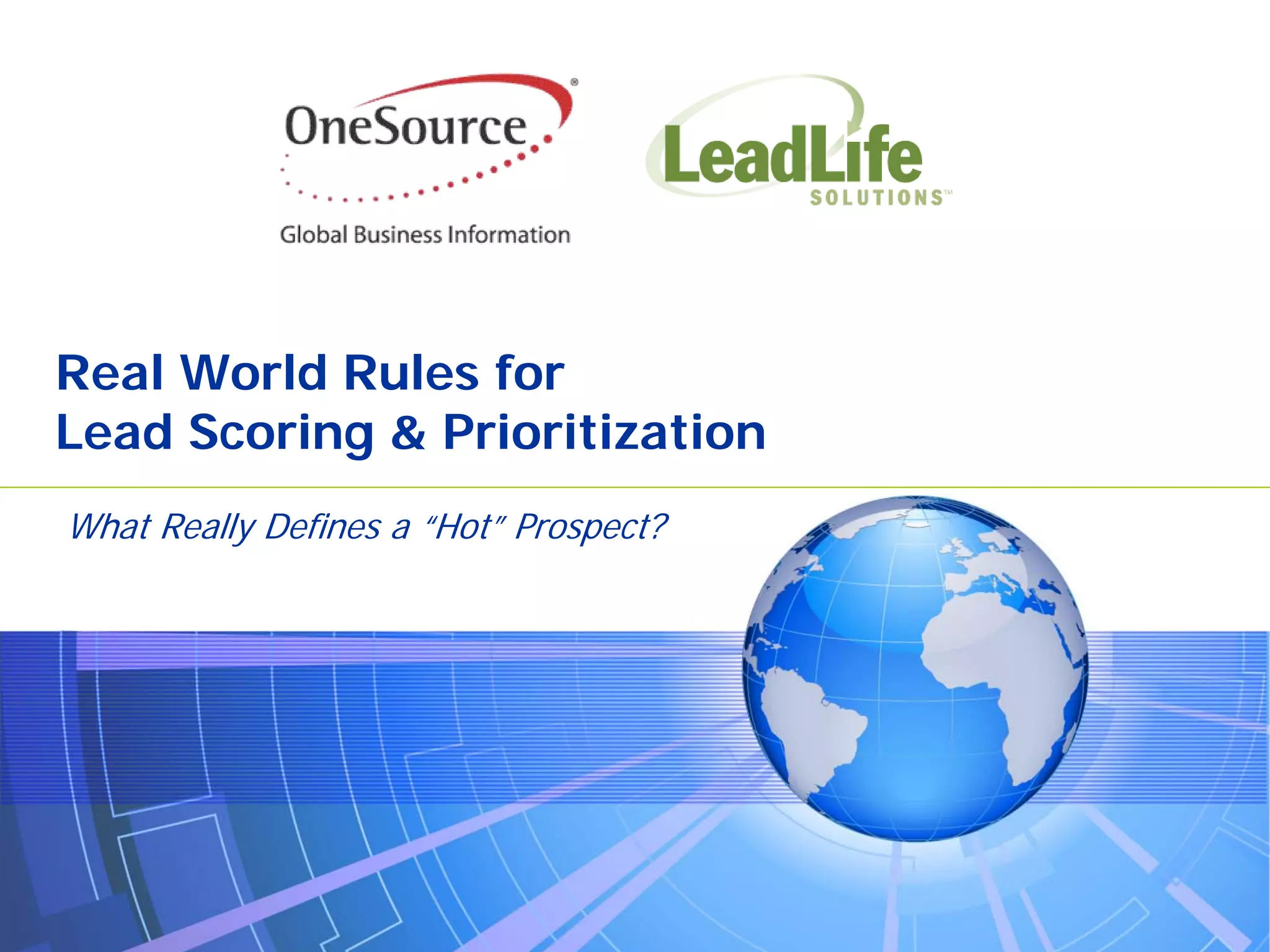 The document discusses effective lead scoring and prioritization strategies for identifying high-quality prospects. It emphasizes the importance of understanding lead behavior and demographics to sort, evaluate, and nurture leads for improved sales results. Key benefits of implementing a lead scoring system include increased qualified leads, shorter sales cycles, and enhanced conversion rates.