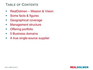 The document is a corporate presentation for RealDolmen that outlines the company's mission, operations, and offerings. RealDolmen aims to be the reference provider of integrated IT solutions in Benelux and France. It has nearly 1,800 professionals and provides a full range of IT services, including infrastructure, applications, communications, and professional services. RealDolmen's offerings are broken down into five business domains: infrastructure solutions, enterprise communications, professional services applications, business solutions, and enterprise solutions.
