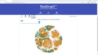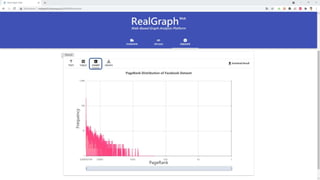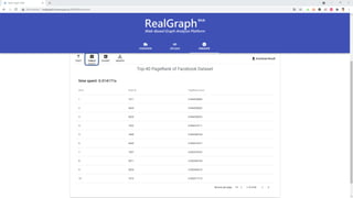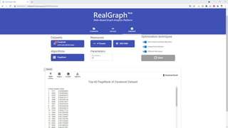 The document describes a graph analysis tool called RealGraph-Web that consists of three tabs: a graph upload tab to upload graph data, an algorithm execution tab to optimize parameters and execute algorithms, and a result visualization and download tab to view and download results in various formats. The tool was presented at the 47th International Conference on Very Large Data Bases in 2021 by researchers from Hanyang University.